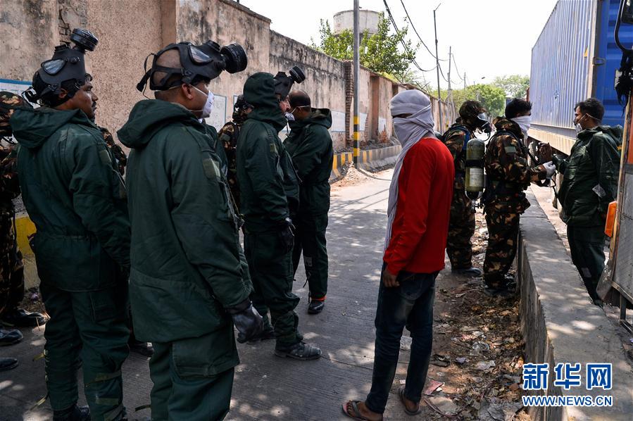 5月6日,在印度新德里,印度全國(guó)救災(zāi)應(yīng)急部隊(duì)成員準(zhǔn)備進(jìn)入煤氣泄漏事故發(fā)生地。據(jù)警方人員稱(chēng),新德里6日發(fā)生煤氣泄漏事故,約有200名學(xué)生出現(xiàn)不同程度的中毒癥狀入院治療。新華社/法新
