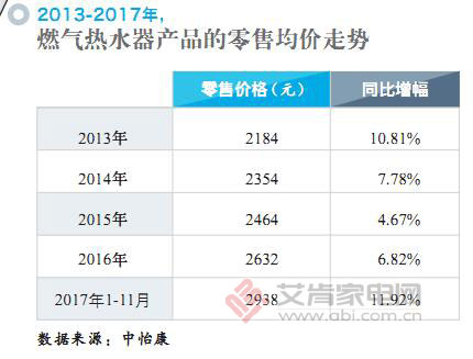 國(guó)內(nèi)外品牌紛紛加碼高端市場(chǎng)的新攻勢(shì),直接帶動(dòng)了燃?xì)鉄崴鳟a(chǎn)品整體均價(jià)的大幅上揚(yáng)。據(jù)中怡康數(shù)據(jù)顯示,2017年1-11月份,燃?xì)鉄崴鞯牧闶劬鶅r(jià)上漲了11.92個(gè)百分點(diǎn)至2938元。盡管考慮到中怡康的監(jiān)測(cè)樣本以連鎖賣場(chǎng)為主,價(jià)格系數(shù)會(huì)相應(yīng)偏高,但如此大的漲幅印證了燃?xì)鉄崴髡诩铀佼a(chǎn)品結(jié)構(gòu)的調(diào)整和升級(jí)。據(jù)《艾肯家電》統(tǒng)計(jì),2017年,我國(guó)燃?xì)鉄崴鳟a(chǎn)品的整體均價(jià)大致維持在2055元左右,同比漲幅約6.15%。