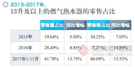 高價(jià)格需要產(chǎn)品技術(shù)上的硬支撐。2017年,無(wú)論線上還是線下,大出水量的燃?xì)鉄崴鳟a(chǎn)品都更加暢銷,其中13L以上(含13L)產(chǎn)品的銷量占比均超過(guò)了50%。在燃?xì)鉄崴鞯?ldquo;安全”問(wèn)題得到解決、“恒溫”成為產(chǎn)品標(biāo)配后,“大升數(shù)”已經(jīng)開(kāi)始主導(dǎo)市場(chǎng),體現(xiàn)了用戶對(duì)洗浴舒適度的更高追求。同時(shí),四季感溫、自動(dòng)變升、斷電記憶、防凍自啟、智控風(fēng)壓、水氣雙閥、語(yǔ)音播報(bào)等更多智能功能的應(yīng)用,也在極大程度上改善了用戶體驗(yàn)。
