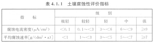 4.1.1土壤腐蝕性應采用檢測管道鋼在土壤中的腐蝕電流密度和平均腐蝕速率判定。土壤腐蝕性評價指標應符合表4.1.1的規(guī)定。