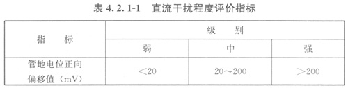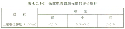 2直流干擾程度評價指標應符合表4.2.1-1的規(guī)定;當管地電位正向偏移值難以測取時,可采用土壤電位梯度指標評價,雜散電流強弱程度的評價指標應符合表4.2.1-2的規(guī)定;
