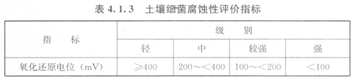 4.1.3當存在細菌腐蝕時,應采用土壤氧化還原電位指標判定土壤腐蝕性。土壤細菌腐蝕性評價指標應符合表4.1.3的規(guī)定。