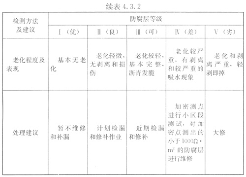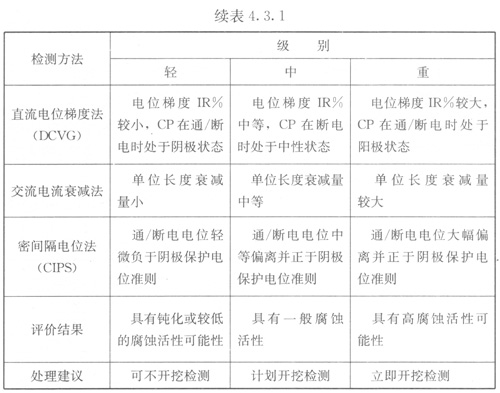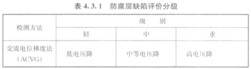 4.3.l管道防腐層缺陷的評價可采用交流電位梯度法、直流電位梯度法、交流電流衰減法和密間隔電位法進行,防腐層缺陷評價分級應符合表4.3.1的規(guī)定。
