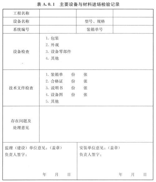 A.0.1主要設(shè)備與材料進(jìn)場檢驗(yàn)記錄可按表A.0.1的格式記錄。