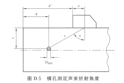 探頭折射角可通過滿足要求的橫孔最大回波來測(cè)定,也可在工件、參考試塊或者是在比例圖紙上直接測(cè)定,如圖D.2所示。