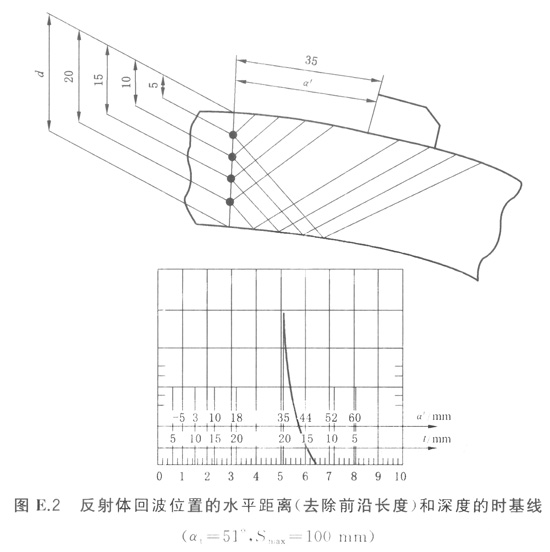 E5.1中闡述的時(shí)基線設(shè)置的原理在這里仍適用,但深度和水平距離不再是線性的。非線性標(biāo)度比例的建立,可在聲程距離比例圖上通過(guò)一系列的位置來(lái)繪出,或由適當(dāng)的公式計(jì)算出,或可從曲面試塊上得到一系列反射體的最高回波來(lái)確定標(biāo)度,中間值可通過(guò)插值法獲得。見圖E.2。