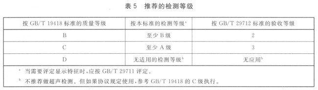 當(dāng)規(guī)定使用ISO 17635時,表5給出了推薦的檢測等級和驗收等級。