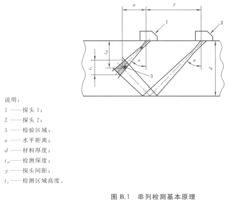 斜探頭間距(y)、聲束軸線交叉點(diǎn)檢測(cè)深度(tm)和檢測(cè)區(qū)域高度(tz)之間的關(guān)系見(jiàn)圖B.1。