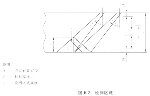檢測(cè)區(qū)域高度(tz)可用參考試塊上不同深度反射體來(lái)測(cè)定,或用接近對(duì)面最大聲程結(jié)合聲束有效直徑來(lái)計(jì)算: