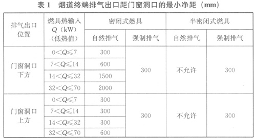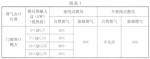 2我國(guó)住宅多數(shù)為多層或高層,多數(shù)燃具煙管高位安裝在本層門(mén)窗洞口上方,即安裝在上層住宅門(mén)窗洞口的下面了,故對(duì)上一層住宅的門(mén)窗洞口會(huì)有煙氣進(jìn)入的問(wèn)題產(chǎn)生。對(duì)居住房間(臥室和起居室)參照英、美標(biāo)準(zhǔn)進(jìn)行了嚴(yán)格的安全間距規(guī)定(1.2~1.5)m,這與英、美單層住宅不同。