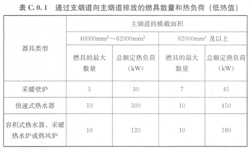 C.0.1主、支并列型共用煙道系統(tǒng)(圖C.0.1),主煙道橫截面積、燃具的最大數(shù)量和總額定熱負荷應(yīng)符合表C.0.1的規(guī)定。
