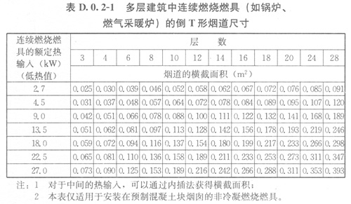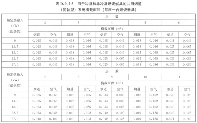 3當每層設(shè)置1臺燃具時,同軸型煙道尺寸應(yīng)按表D.0.2-3的規(guī)定采用。