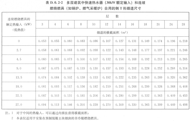 2當采暖模式的最大燃氣流量小于熱水模式的最大燃氣流量時,倒T形煙道尺寸應(yīng)按表D.0.2-2的規(guī)定采用。