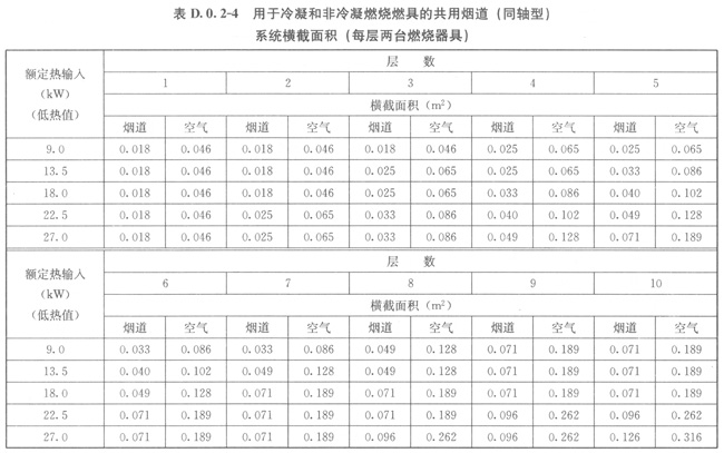 4當每層設(shè)置2臺燃具時,同軸型煙道尺寸應(yīng)按表D.0.2-4的規(guī)定采用。