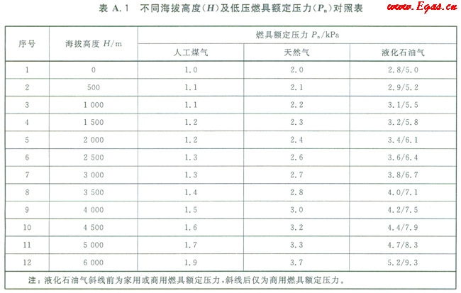 表A.1給出了不同海拔高度(H)及低壓燃具額定壓力(Pn)的對(duì)照表。