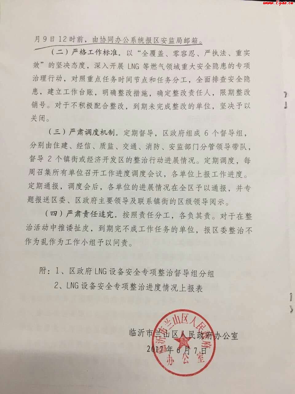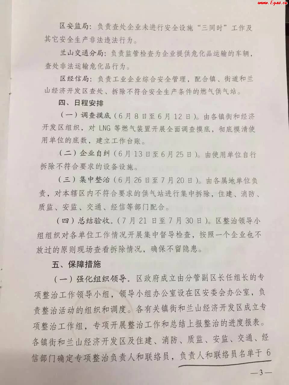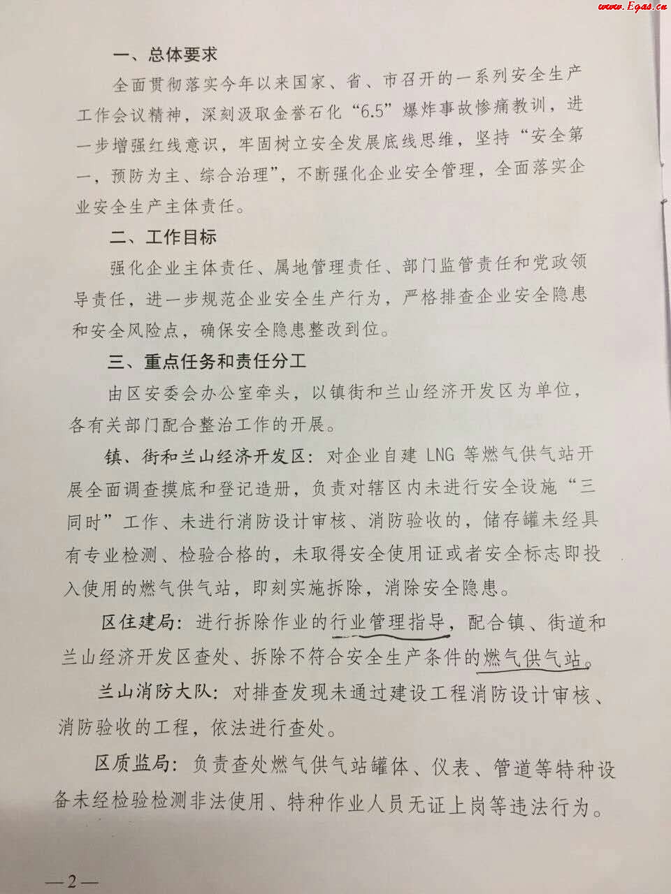 臨沂市蘭山區(qū)人民政府下發(fā)了關(guān)于開展企業(yè)自用LNG設(shè)備等燃?xì)獍踩珜m椪涡袆拥耐ㄖ?。通知明確了鎮(zhèn)、街和蘭山經(jīng)濟開發(fā)區(qū)、區(qū)住建局、蘭山消防大隊、區(qū)質(zhì)監(jiān)局、區(qū)安監(jiān)局、蘭山交通分局以及區(qū)經(jīng)信局等各部門的主要任務(wù)和責(zé)任分工,其中區(qū)住建局進行拆除作業(yè)的行業(yè)管理指導(dǎo),而鎮(zhèn)、街道和蘭山經(jīng)濟開發(fā)區(qū)具體執(zhí)行拆除作業(yè)。此外,通知還明確了專項整治行動的各個時間節(jié)點,企業(yè)自行拆除和各屬地單位集中拆除的時間節(jié)點需要注意。