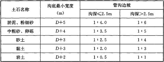 1 河底管溝的溝底寬度和邊坡尺寸應(yīng)根據(jù)土石性質(zhì)、水流速度、開挖深度和施工方法等因素確定,必要時可進行試挖。當(dāng)無試驗條件和數(shù)據(jù)時,開挖管溝尺寸可分別按表5.2.4-1和表5.2.4-2確定。