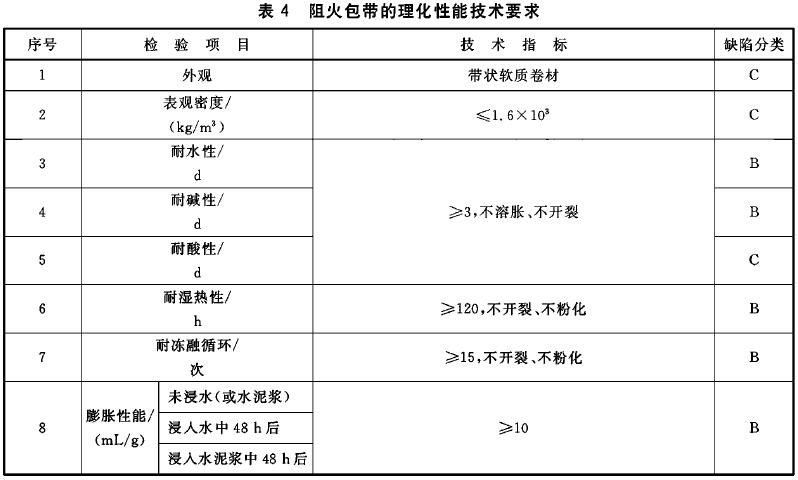 5.3.3 阻火包帶的理化性能應符合表4的規(guī)定。