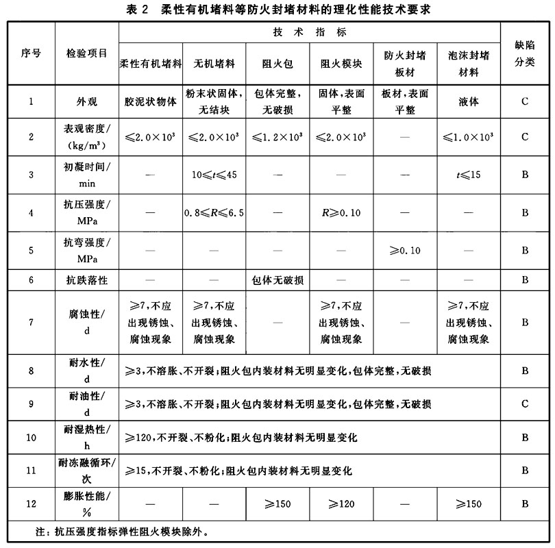 5.3.1 柔性有機堵料、無機堵料、阻火包、阻火模塊、防火封堵板材和泡沫封堵材料的理化性能應符合表2的規(guī)定。
