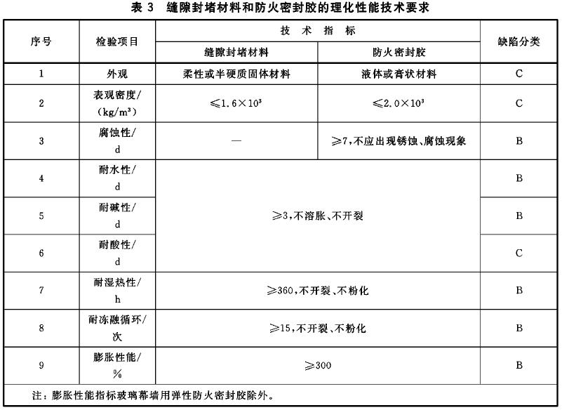 5.3.2 縫隙封堵材料和防火密封膠的理化性能應符合表3的規(guī)定。