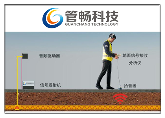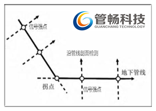 在探測(cè)過(guò)程中,如果沿管道走向探測(cè)時(shí),聲音突然減弱,這時(shí)可在此點(diǎn)與上一個(gè)點(diǎn)之間詳細(xì)監(jiān)聽(tīng),找出聲音最強(qiáng)點(diǎn)即為彎頭所在位置(一般情況下由于聲波在管道彎頭處與管壁摩擦加劇,因此信號(hào)比直線位置點(diǎn)信號(hào)更強(qiáng))。同時(shí)可以回到上一個(gè)點(diǎn)以此點(diǎn)為圓心,以3米為半徑沿圓周線盲找,在找出信號(hào)最強(qiáng)點(diǎn)后,再以此點(diǎn)為圓心沿圓周,找出另一個(gè)信號(hào)較強(qiáng)的位置點(diǎn),將這兩點(diǎn)連成一條直線。在確定兩條管線走向后,將這兩條管線延伸交匯于一點(diǎn),該點(diǎn)即可判定為管線的拐點(diǎn)。在實(shí)際探測(cè)過(guò)程中,可以結(jié)合兩種方法綜合判斷。此外如果在沿圓周盲探時(shí),沒(méi)有遇到信號(hào)強(qiáng)點(diǎn),可擴(kuò)大探測(cè)半徑尋找信號(hào),如果確定無(wú)法找到信號(hào)源,可判定此處為管道終點(diǎn),此時(shí)可以在上個(gè)點(diǎn)沿走向詳查,找出信號(hào)最大點(diǎn)即為管道終點(diǎn)。