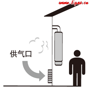 ① 確保安裝場所留有大于130cm²面積的進(jìn)、排氣窗口。進(jìn)、排氣口分別設(shè)在接近地面和天花板的位置,并能夠與戶外直接連通。進(jìn)氣口應(yīng)盡可能遠(yuǎn)離器具的排煙管,防止煙氣倒流到安裝器具的房間內(nèi)。