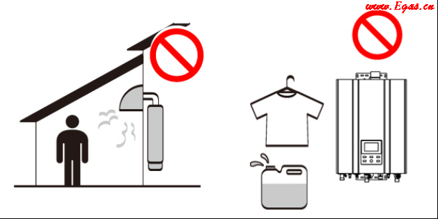 ④ 安裝前確認(rèn)熱水器安裝的場所具有良好的通風(fēng)換氣效果,附近無易燃易爆及腐蝕性的危險品;