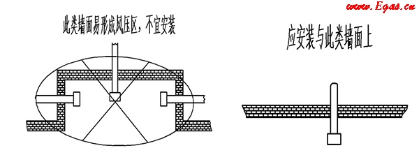 - ④ 防風(fēng)煙管安裝完成后,防風(fēng)罩應(yīng)保持距離墻面500mm以上,以脫離風(fēng)壓區(qū)。