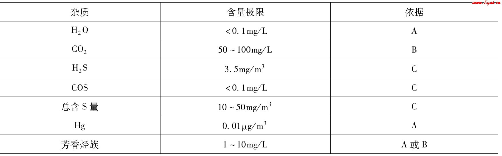 在進(jìn)行天然氣液化之前,必須將天然氣中的酸性氣體和雜質(zhì)如H2S、CO2、H2O、Hg等進(jìn)一步去除,以免它們在低溫下凍結(jié)而堵塞、腐蝕設(shè)備和管道,并提高產(chǎn)品的純度。表2-1列出了基地型LNG工廠天然氣預(yù)處理標(biāo)準(zhǔn)和雜質(zhì)的最大允許含量。