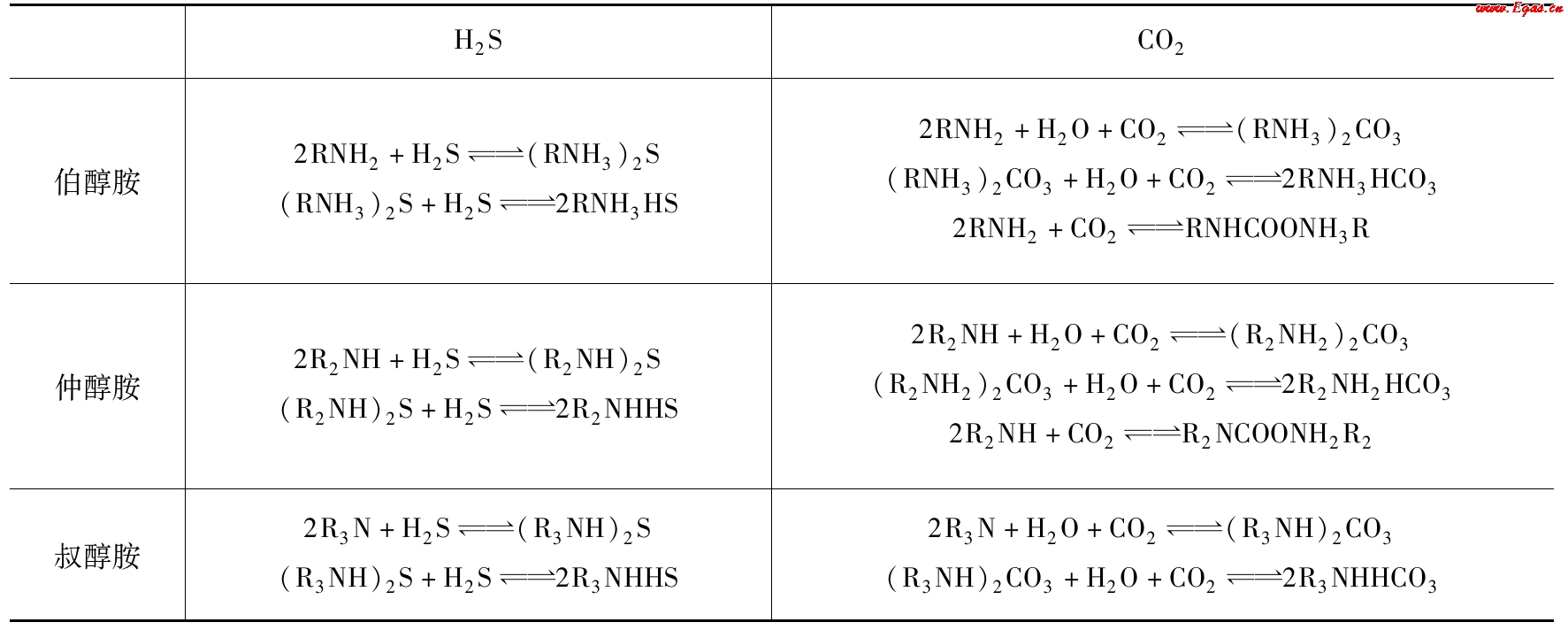 表2-3 醇胺吸收H2S和CO2的主要反應(yīng)