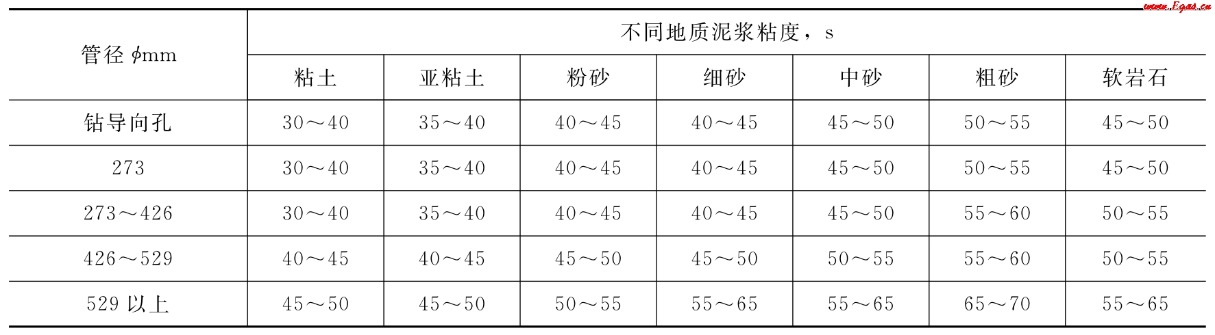 泥漿粘度應根據(jù)地質情況和管徑大小確定,泥漿粘度值可參照表4-1-1的規(guī)定。定向鉆所采用的泥漿相對密度為1.1~1.2,泥漿的相對密度應根據(jù)地質條件而定,卵石地層應加大泥漿的密度。泥漿粘度宜用馬氏漏斗測量,每2h測一次。