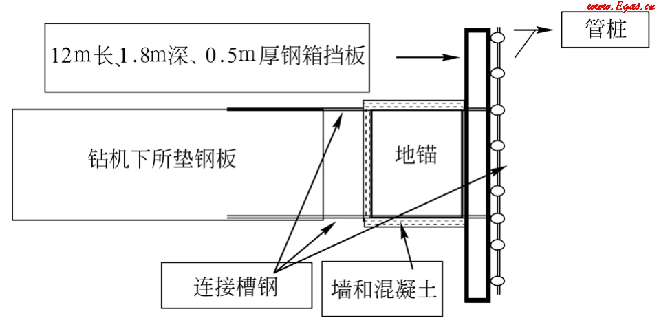 (4)鉆機的錨固對于定向鉆來說非常重要。鉆機在安置期間發(fā)生事故的情況經常發(fā)生,甚至和鉆進期間發(fā)生事故的概率相當,尤其是對地下管線的損壞。在鉆機錨固時,要防止將錨桿打在地下管線上。合理的鉆機錨固是順利完成鉆孔的前提,鉆機的錨固能力反映了鉆機在給進和回拉施工時利用其本身功率的能力。一臺鉆機的推拉力再大,如果鉆機在推拉過程中發(fā)生了移動,其推拉力不但會降低,而且可能會出現(xiàn)孔內功率損失,這時會出現(xiàn)鉆機的全部功率作用在鉆機機身上,容易發(fā)生設備破壞和人員傷害。如果鉆機本身的固定能力差,一方面鉆機的控制能力降低,從而導致無法很好地按預定的計劃完成鉆進工作;另一方面,鉆機在運轉過程中振動較大,會引起鉆桿發(fā)生彎曲或損壞,使鉆孔無法按預先設計的軌跡完成。尤其對于大口徑、長距離管道穿越,回拖力大,施工周期長,施工中容易造成地錨失穩(wěn),導致穿越失敗,對此可采取如圖4-1-8所示的方法進行加固。
