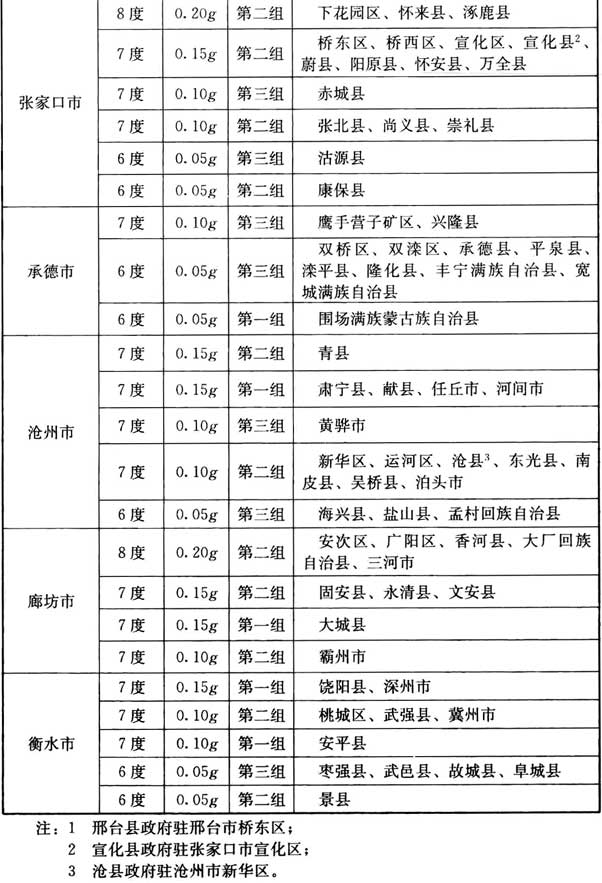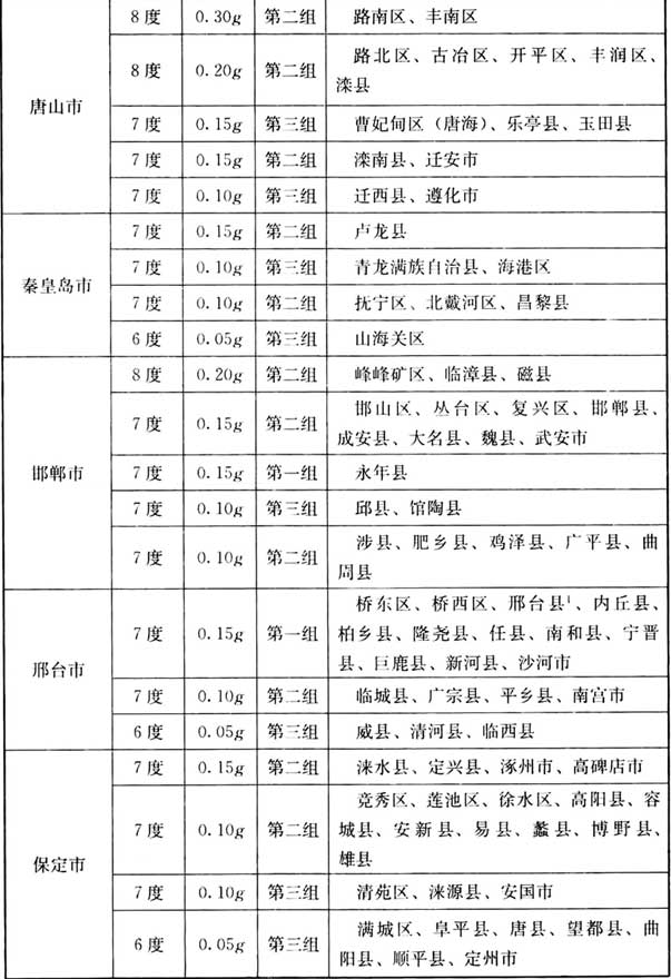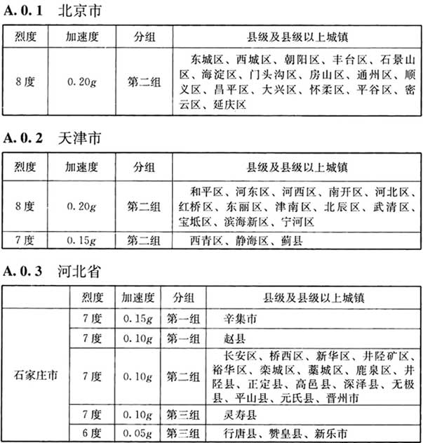 本附錄僅提供我國各縣級(jí)及縣級(jí)以上城鎮(zhèn)地區(qū)建筑工程抗震設(shè)計(jì)時(shí)所采用的抗震設(shè)防烈度(以下簡稱“烈度”)、設(shè)計(jì)基本地震加速度值(以下簡稱“加速度”)和所屬的設(shè)計(jì)地震分組(以下簡稱(“分組”)。本表摘自《建筑抗震設(shè)計(jì)規(guī)范》 GB50011-2010(2016年版)附錄A