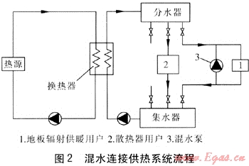 混水連接的工藝結構簡潔,降低了熱網(wǎng)造價,循環(huán)泵的耗電量低,節(jié)省運行費用。隨著供熱系統(tǒng)逐漸完善,在擴增或新建的供熱區(qū)域,采用大混合比的混水連接方式,特別是針對不同供暖方式的用戶無疑成為首要考慮的連接方式。