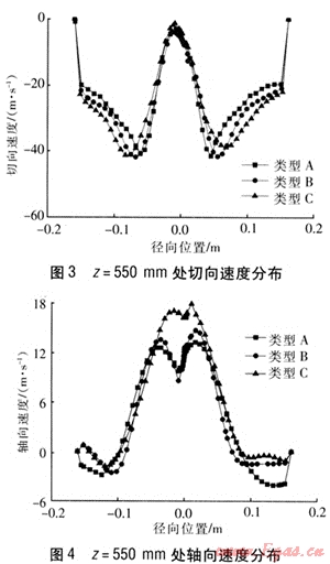 切向速度和軸向速度是影響旋風分離器分離效率的重要因素,本文選取z=550、670mm高度上的軸向速度和切向速度,分析柱形空間和環(huán)形空間內的切向速度和軸向速度分布。逆時針方向為切向速度的正方向,z軸正方向為軸向速度的正方向。由于本文的旋風分離器為順時針切向進氣,因此分離器內流體的切向速度為負。入口風速為15m/s時,3種類型的旋風分離器在z=550mm高度上氣相流體的切向速度分布和軸向速度分布見圖3、4。由圖3、4可知,在柱形空間的外旋渦區(qū),類型A旋風分離器壁面切向速度最小,類型B次之,類型C最大。即隨著高寬比的增大,旋風分離器壁面附近的流體切向速度增大。類型A旋風分離器的切向速度最大值的徑向位置離壁面最遠,類型B次之,類型C最近,即隨著高寬比的增大,切向速度的最大值的徑向位置逐漸向壁面靠攏。在旋風分離器內,固體顆粒主要是在高速旋轉產生的離心力作用下從氣體中分離出來的。當分離器的高寬比增大時,壁面附近的切向速度變大,最大切向速度的徑向位置更靠近壁面。由于壁面切向速度變大以及外旋渦向壁面靠近,氣固兩相流中的顆粒所受的離心力變大,更容易擺脫氣相流體的牽引,被壁面捕集而被分離,從而提高分離效率。