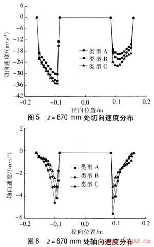 入口風速為15m/s時,3種類型的旋風分離器在環(huán)形空間內z=670mm高度上的切向速度分布和軸向速度分布見圖5、6。由圖5、6可知,類型A旋風分離器切向速度最小,向下的軸向速度最大;類型B次之;類型C分離器切向速度最大,向下的軸向速度最小。即隨著高寬比的降低,向下的軸向速度增加。環(huán)形空間內氣流向下的軸向速度增加,特別是靠近排氣管壁外側的氣流向下的軸向速度增加較大,這也會加劇“短路流”現(xiàn)象,導致分離效率的降低。