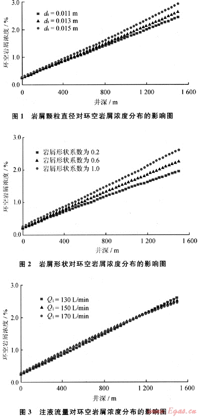 由圖1~3可知:隨著井深的增加,環(huán)空巖屑濃度隨之增大,在井底處環(huán)空巖屑濃度最大。這是因?yàn)榄h(huán)空中的壓力隨井深的增加而增加,壓力使泡沫質(zhì)量和流速減小,降低了泡沫攜帶巖屑能力,所以巖屑沉降速度增大,巖屑濃度增大;由圖1可知:巖屑顆粒直徑越大,環(huán)空巖屑濃度隨之增大,這是因?yàn)?,巖屑顆粒直徑的增大使泡沫與巖屑之間的滑移速度變大,即巖屑的流動(dòng)速度降低,所以巖屑濃度增大。由于鉆井過(guò)程中產(chǎn)生的巖屑顆粒直徑并不完全相等,若假設(shè)巖屑顆粒直徑相同,會(huì)對(duì)計(jì)算結(jié)果產(chǎn)生一定的誤差。