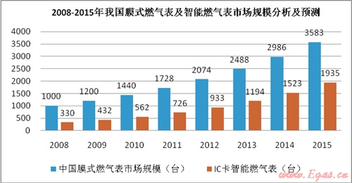 根據(jù)中國計(jì)量協(xié)會的相關(guān)數(shù)據(jù),我國目前約有100家燃?xì)獗韽S,2008年總產(chǎn)量為1000萬臺,每年的復(fù)合增長率約為20%。具有中國特色的智能膜式燃?xì)獗恚訧C卡預(yù)付費(fèi)為主導(dǎo)產(chǎn)品,總量逐年上升,已占膜式燃?xì)獗砜偭康?0%以上。預(yù)計(jì)2015年我國燃?xì)獗砜偖a(chǎn)量為3583萬臺,智能燃?xì)獗砜偖a(chǎn)量為1935萬臺。