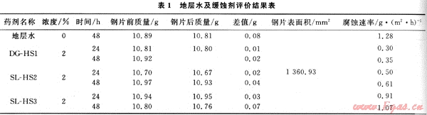 初步評價的結果為:地層水的腐蝕速率較高,為1.28g/m2·h,因此,在修井過程中應當采取必要的防腐蝕措施;由表1中結果可知,咪唑啉類的緩蝕劑(DG-HS1)的腐蝕速率最低,故選其作為修井液的組成成分之一。