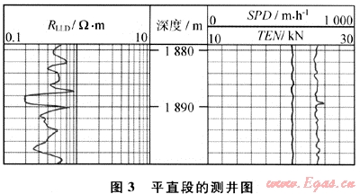 圖3為資料中感應電阻率曲線(RILD)及同次測井帶測的張力曲線(TEN)、速度曲線(SPD)。軟件利用曲線擬合法檢查出1888.11~1889.21m為平直段(幅度值均為0.2Ω·m,該段相對均方差為0),同時張力曲線和速度曲線在相應的深度段沒有明顯異常,說明并不是因為儀器遇卡現(xiàn)象引起的平直段.因此軟件判斷1888.11~1889.21m為平直異常。