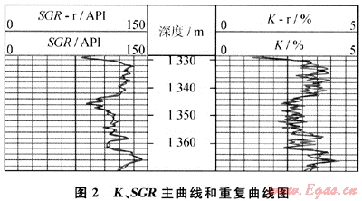 圖2為資料中深度校正后的總自然伽馬(SGR)、鉀含量(K)曲線的主曲線和重復曲線圖,石油天然氣行業(yè)標準SY/T 5132—2003《測井原始資料質量要求》中對自然伽馬能譜測井重復性的要求為:重復曲線與主曲線形狀基本相同,總自然伽馬重復測量值相對誤差應小于5%,鉀的重復測量值相對誤差應小于10%。結合企業(yè)生產(chǎn)實際,約定重復誤差符合標準的井段總長度不得少于45m(常規(guī)測井重復曲線至少測50m,50m時90%要符合標準,即50×90%=45m)。軟件經(jīng)計算得:曲線SGR重復曲線與主曲線相關系數(shù)為0.983,曲線校深后,重復誤差符合標準的井段總長度為53.5m;曲線K重復曲線與主曲線相關系數(shù)為0.765,校深后,重復誤差符合標準的井段總長度為36.5m。因此,軟件得到重復性檢查結論:曲線SGR合格,曲線K不合格。