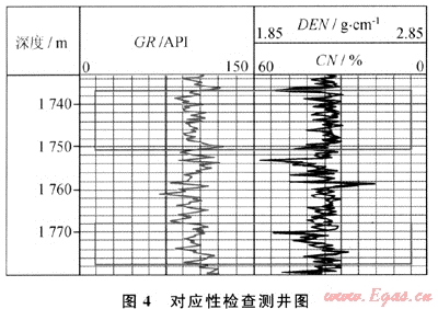 圖4是資料中伽馬曲線(GR)、密度曲線(DEN)、中子曲線(CN)。以GR曲線為基準曲線劃分層段并挑選層段,1736.81~1750.61m和1768.01~1777.51m(圖中紅框標示)是軟件挑選的兩個層段,在兩個層段DEN曲線和CN曲線的相關系數(shù)分別為-0.75和-0.74,與預先設置的規(guī)則(負相關、最小相關系數(shù)0.7,依據(jù)地區(qū)經(jīng)驗設置)相比,軟件判斷DEN曲線和CN曲線的對應性合格。