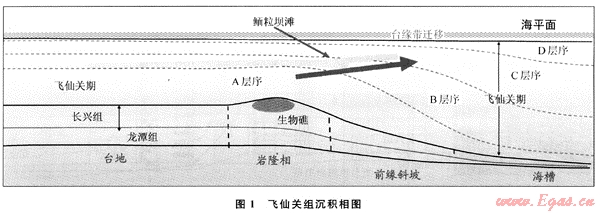 四川盆地上二疊統(tǒng)一下三疊統(tǒng)飛仙關組的三級層序的劃分按沉積體系域理論分為低位體系域、海侵體系域、高位體系域。低位體位域(LST)為龍?zhí)督M(P2l),海侵體系域(TST)為長興組(P2ch),高位體系域(HST)為飛仙關組(T1f)。飛仙關組高位體系域進一步劃分為早期高位體系域(EHST)和晚期高位體系域(LHST)。圖1為飛仙關組早、晚期高位域的沉積特征,其中層序A為高位早期,層序B-D為高位晚期,而B、層序C是鮞灘儲層發(fā)育的主要層序。