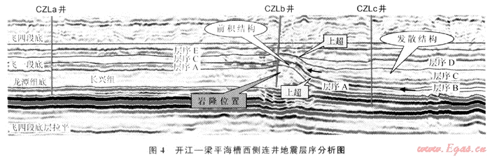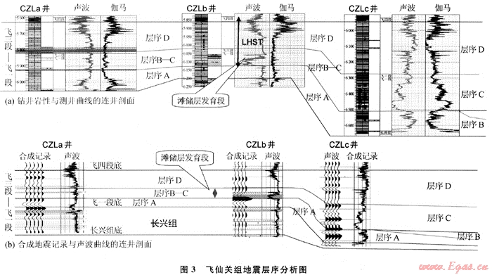 圖3是開江-梁平海槽西側(cè)分別位于臺地、生物巖隆和海槽的3口井的連井圖,利用測井資料與地震資料將飛一段至飛三段劃分出4套地震層序,合成地震記錄中黃色區(qū)域為儲層段。層序A為高位早期,水體較深,儲層基本不發(fā)育。層序B-C為高位晚期,儲層開始發(fā)育,CZLb井位于臺緣帶上,儲層段聲波曲線明顯降低,其儲層厚度較大,合成記錄上儲層底部地震反射明顯增強;開闊臺地內(nèi)CZLa井在層序B-C內(nèi)雖有一定的儲層發(fā)育,但厚度明顯變薄,合成記錄上儲層底部反射異常與臺緣帶反射相比異?,F(xiàn)象降低;位于深水海槽內(nèi)CZLc井在層序B-C內(nèi)無儲層發(fā)育。