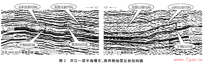 礁、灘的發(fā)育與其沉積前的古地貌關系密切,在高地或淺水臺地邊緣,其水動力相對較強,有利于礁或灘的生長。若古高地暴露地表,則更有利于石灰?guī)r的次生白云化改造,促使優(yōu)質(zhì)儲層發(fā)育[7~8]。斜坡陡緩程度反映了水體能量的高低,圖2為開江-梁平海槽東、西兩側(cè)地震剖面,在海槽東西側(cè)具有明顯的前積和發(fā)散反射結(jié)構(gòu),其中前積反射結(jié)構(gòu)為早期高位體系域所具有的特征,發(fā)散反射結(jié)構(gòu)為晚期高位體系域所具有的特征。兩種反射結(jié)構(gòu)表明:飛仙關組沉積早期是繼承上二疊統(tǒng)沉積方式的欠補償沉積,而非快速充填沉積。