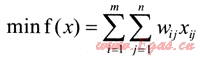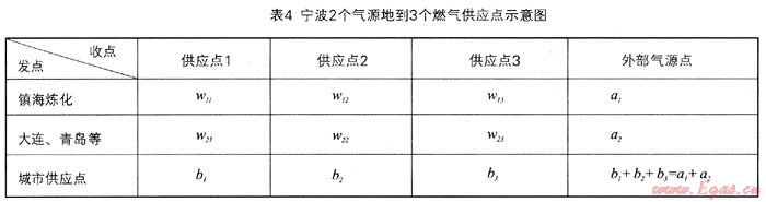 假設(shè)有m個(gè)外來氣源點(diǎn),n個(gè)該城區(qū)燃?xì)夤?yīng)(銷售)點(diǎn)。則令以a1,a2,…am表示各外來氣源點(diǎn)運(yùn)至該市的輸出量,b1,b2,…,bn表示各供應(yīng)(銷售)點(diǎn)的燃?xì)馊菁{量(銷售量),有∑ai=∑bj。xij表示氣源地i運(yùn)往供應(yīng)點(diǎn)j的運(yùn)氣量,wij表示相應(yīng)的單位運(yùn)氣量的運(yùn)輸時(shí)間(單位運(yùn)氣量的運(yùn)輸時(shí)間因運(yùn)輸方式的不同而改變),如表2所示