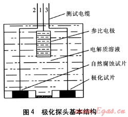 極化探頭由測試試片(自然腐蝕試片和極化試片)、參比電極和電解質(zhì)組成,其基本結(jié)構(gòu)見圖4。極化試片用和管道相同的材質(zhì)制成,并用導(dǎo)線與管道相連,外部用絕緣體隔離,只留一個多孔塞子(滲透膜)作為測量通路,這樣的結(jié)構(gòu)可使參比電極和燃氣管道之間的電阻壓降最小,直接測量無IR降電位,而不必斷開管道保護電流或間歇中斷與管道連接的電纜。只有將電位測試探頭處于與管道相同的土壤中,電位測試探頭才有效。
