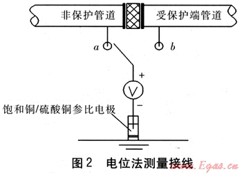 在絕緣接頭性能良好的情況下,點b處電位Vb在數(shù)值上和管道陰極保護電位相近(-850~-1200mV),點a處電位Va在數(shù)值上與管道自然電位相近。根據(jù)測量結(jié)果,若Vb明顯地比Va更小(電位差的絕對值為200~500mV),則認(rèn)為絕緣接頭的絕緣性能良好。如果電位差的絕對值小于200mV,則應(yīng)該使用其他檢測方法進一步測量怕-,以確定絕緣接頭是否失效。