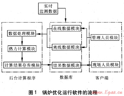 鍋爐優(yōu)化運(yùn)行軟件的核心功能在于利用監(jiān)測(cè)數(shù)據(jù)通過(guò)對(duì)鍋爐運(yùn)行可調(diào)參數(shù)的控制使鍋爐實(shí)現(xiàn)安全經(jīng)濟(jì)運(yùn)行。鍋爐優(yōu)化運(yùn)行軟件基于B/S模式(瀏覽器/服務(wù)器模式,即用戶工作界面通過(guò)IE瀏覽器來(lái)實(shí)現(xiàn))的Web網(wǎng)絡(luò)數(shù)據(jù)庫(kù)應(yīng)用系統(tǒng),可以在線顯示鍋爐受熱面的壁溫?cái)?shù)據(jù)、污染物數(shù)據(jù)等,可指導(dǎo)現(xiàn)場(chǎng)人員操作。數(shù)據(jù)庫(kù)采用SQL Server2000,后臺(tái)計(jì)算程序采用Visual C++語(yǔ)言編寫(xiě),結(jié)合在線監(jiān)測(cè)數(shù)據(jù)進(jìn)行鍋爐運(yùn)行調(diào)節(jié)[3]。鍋爐優(yōu)化運(yùn)行軟件的流程見(jiàn)圖1。
