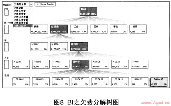 傳統(tǒng)的報表多以行列分布,很難實現(xiàn)數(shù)據(jù)層層展示,GDIA系統(tǒng)利用BI技術(shù)突破了傳統(tǒng)報表的框架。如圖8欠費(fèi)分解樹為例,以用戶性質(zhì)作為第一層、年份作為第二層、月份作為第三層、日期作為第四層,不僅將欠費(fèi)情況分解到不同的用戶性質(zhì),直觀的展現(xiàn)出欠費(fèi)用戶的結(jié)構(gòu),同時還根據(jù)不同的年份、月份、日期讓管理者清晰的了解不同用戶性質(zhì)欠費(fèi)年趨勢、月趨勢、年對比、月對比,便于管理者及時調(diào)整對策,增強(qiáng)欠款催討管理力度。